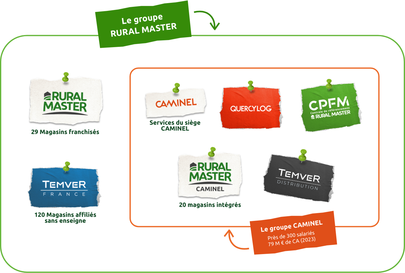 Le Groupe Rural Master est une organisation structurée autour de plusieurs composantes complémentaires, intégrant le Groupe Caminel et le reste du réseau de magasins franchisés.